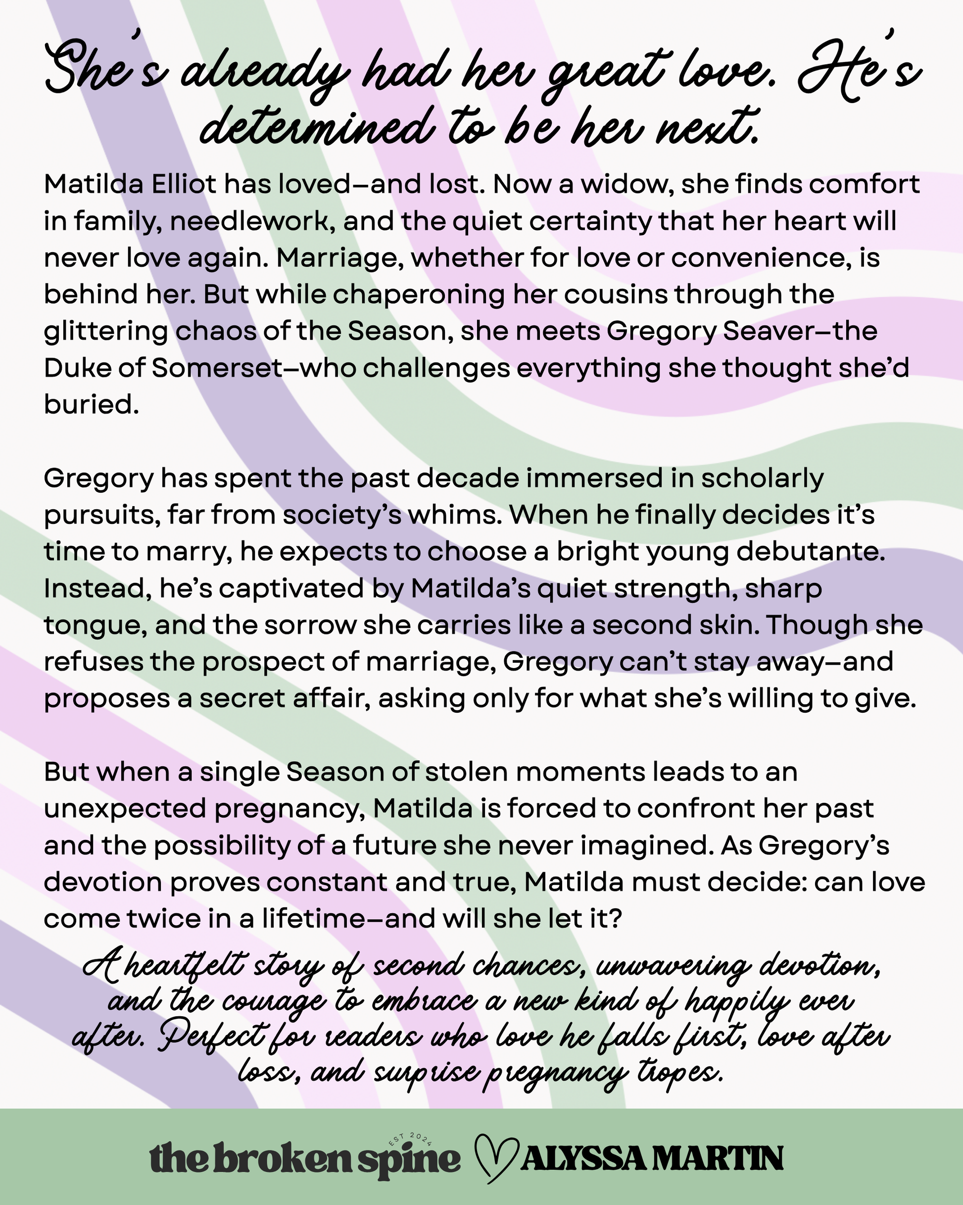 Matilda Elliot has loved—and lost. Now a widow, she finds comfort in family, needlework, and the quiet certainty that her heart will never love again. Marriage, whether for love or convenience, is behind her. But while chaperoning her cousins through the glittering chaos of the Season, she meets Gregory Seaver—the Duke of Somerset—who challenges everything she thought she’d buried.